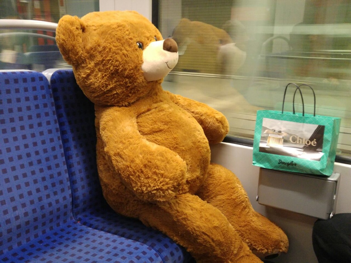 Teddy am Neujahrstag (1.1.2018) in der S-Bahn. Er hatte die Silvesterparty gut überstanden.